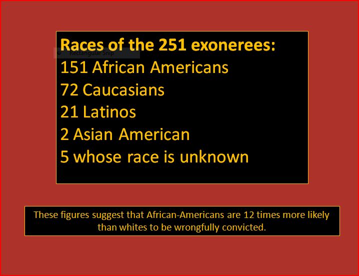Unfortunately, these tough bargaining techniques worked just as well with the innocent as with the guilty. In recent years, improvements in DNA testing have reversed over 250 felony convictions. If these cases are representative, African-American defendants are more than 12 times as likely to be wrongfully convicted as white defendants.