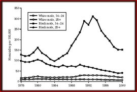 Murder rates for white males showed little fluctuation during this period, and rates for black males over 25 fell dramatically. But for black males 24 and younger, the homicide rate almost tripled. Anyone who seemed to be making excuses for “the thugs” was shouted down.
