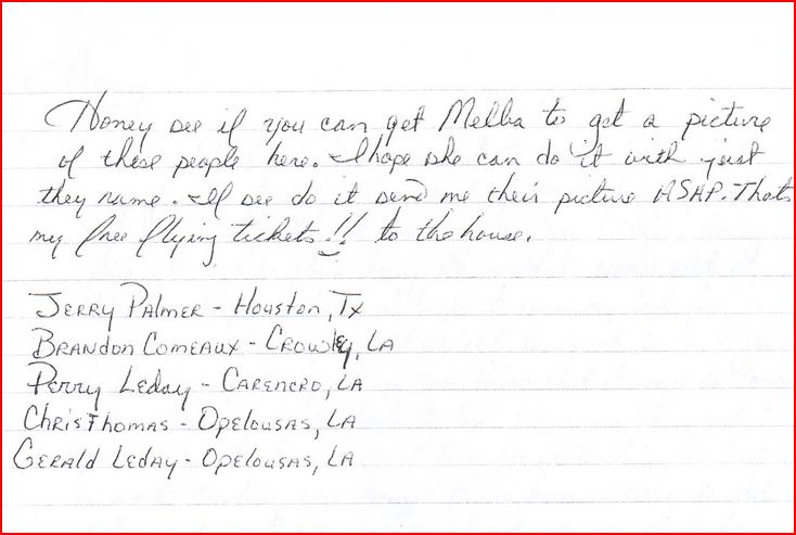 If your eyesight is less than stellar here’s the translation: “Honey, see if you can get Melba to get a picture of these people here. I hope she can do it with just they name (sic). If she do it send me their pictures ASAP. That my free flying tickets!! to the house.”