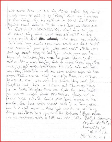 Here’s the salient portion of the letter reproduced above: “Make some shit up about Perry and Josh Bob [two of the defendants the snitches had targeted] where ya’ll use to hang out in Texas. You have to make these people believe they was buying a lot of work [drugs] from you. But once you get with Joe Pisano he will look out for you. Say, Josh Bob would be with another nigga out here name Tellis you’ve might have seen them in H-town [Houston] before I know you seen him before they would be together out their in H-town (sic) . . . The nigga Tellis is a little Brighter [darker complected] than me about the same height as me & weighs about 185-200 lbs. stays with a short hair cut. He should still have braces in his mouth. So don’t even sweat that time they gave you it doesn’t mean a things just watch an see how things go. Make sure you sign the Kastigar letter (sic) before you do anything. Here is a DA you can write: