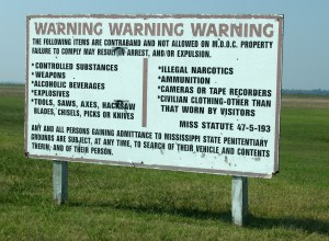 The Mississippi Department of Corrections follows the same stern logic I frequently run up against in Texas and Louisiana. “Offenders” are regarded as non-citizens who have surrendered the right to human dignity. It is assumed that the folks who come to visit these people fit essentially the same category–hence the harsh “up-against-the-wall” signage that typically greets the families and friends of prison inmates.