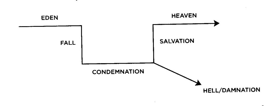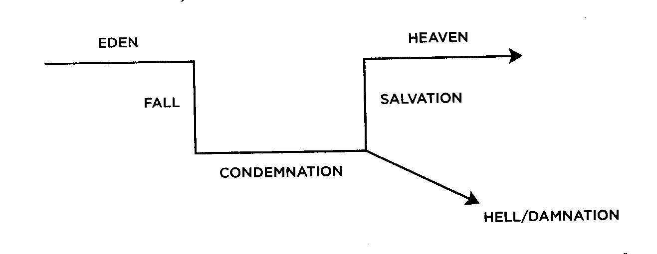 McLaren suggests that this view of religious history rests on the assumptions of Greek philosophy. A similar diagram flows from Roman power politics in which the world falls into barbarism and is restored to the “Peace of Rome” (Pax Romana). Or, in a more contemporary version, the world slides into a socialistic shadow world and is restored to the glories of capitalism and democracy, what we call “the free world”.