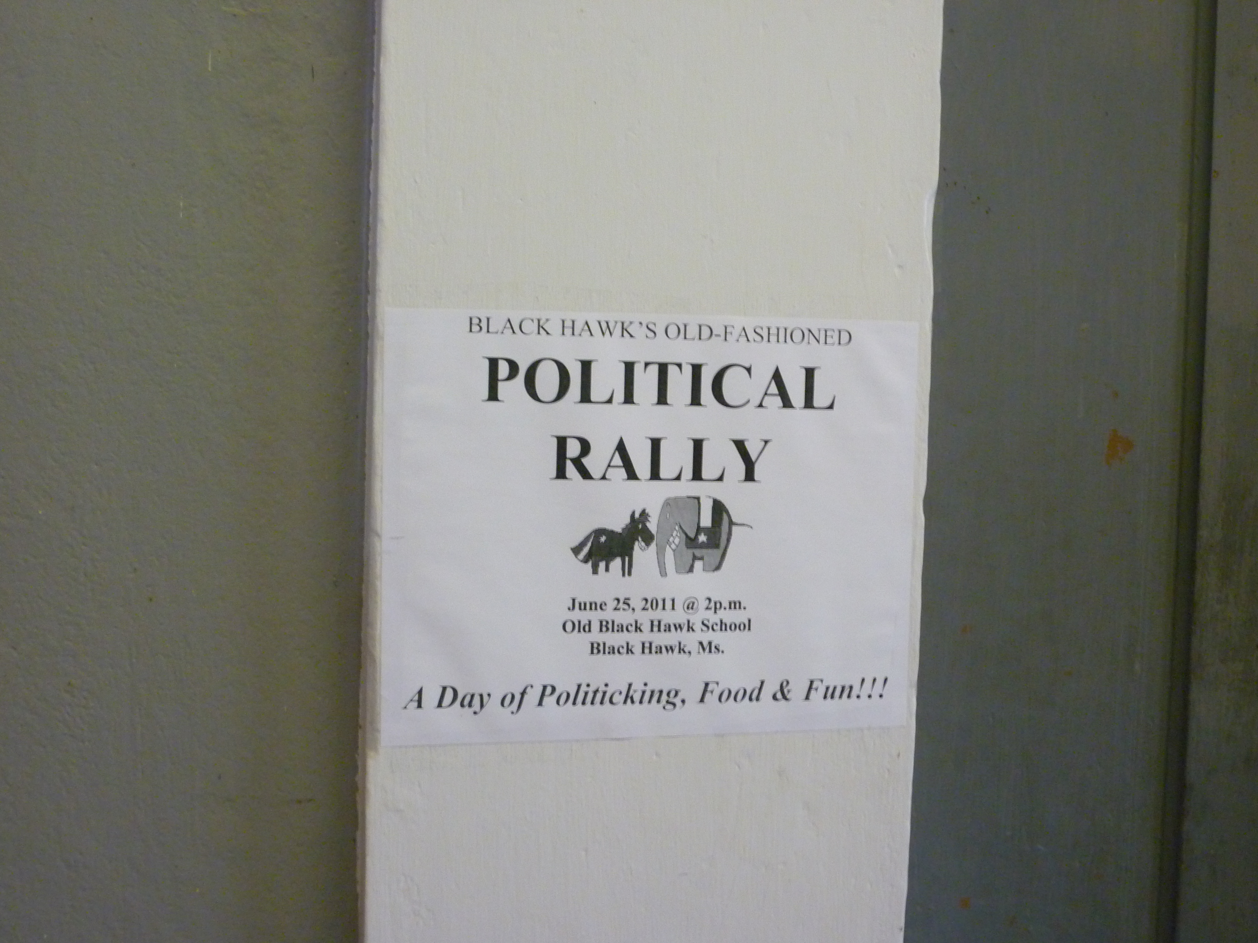 Inside the Carroll County Courthouse we encountered an advertisement for “Black Hawk’s Old Fashioned Political Rally, June 25, 2011, A day of politicking, food and fun!”