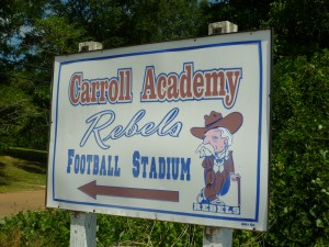 pointing to the Carroll Academy, an all-white private school founded shortly after the federal government finally ended segregated public schooling in Mississippi. Pictures on the school’s website portray hundreds of fans cheering for their beloved Rebels, but you won’t find a black face among them. This is intentional.