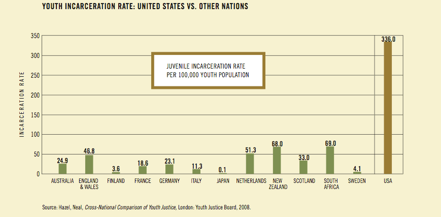 “A recently published international comparison found that America’s youth custody rate (including youth in both detention and correctional custody) was 336 of every 100,000 youth in 2002 —nearly five times the rate of the next highest nation (69 per 100,000 in South Africa).”