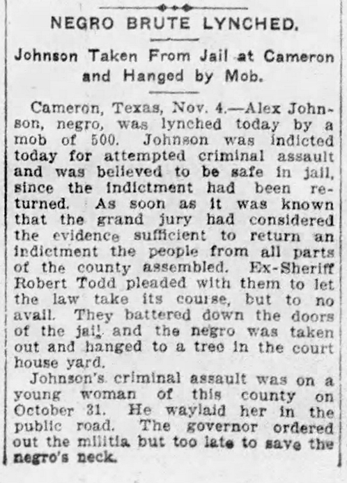 A Legal Lynching: We begin with the tragic story of Alex Johnson, a Black man accused in 1907 of the “attempted assault” of a White girl. When the good people of Milam County learned that the death penalty wasn’t on the table, they marched on the jailhouse prior to trial, battered down the door with sledgehammers, and lynched the suspect on a tree in front of the courthouse.