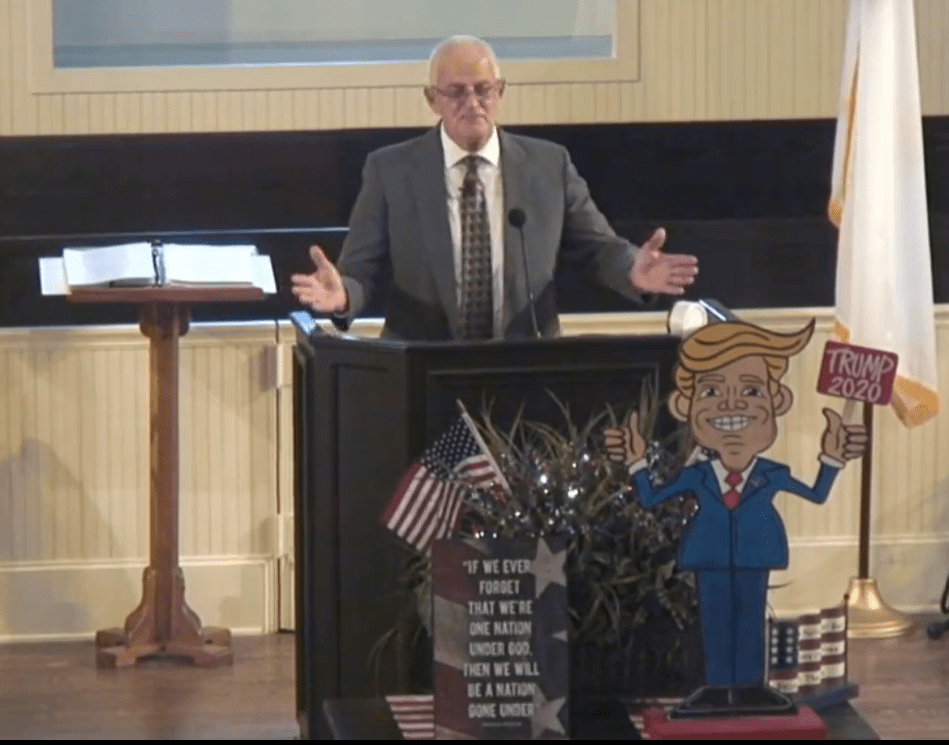 “I want to tell you about a friend this morning who has endured such wrath, vitriol, and hatred,” Kirk began. “As a matter of fact, he’s with us today.” At this point, Brother Wayne exited the pulpit, returning seconds later with a three-foot-tall cardboard cutout of Trump giving the thumbs-up sign with one hand and waving a “Trump 2020” placard in the other.