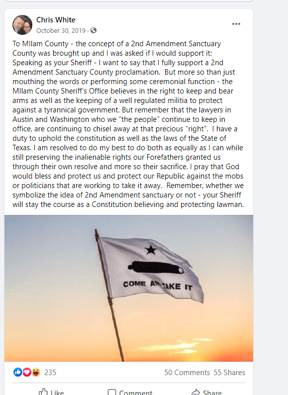 When White was asked if he was willing to support making Milam County part of the Second Amendment Sanctuary movement, he expressed strong support on his Facebook page. “The Milam County Sheriff’s Office believes in the right to keep and bear arms as well as the keeping of a well regulated militia to protect against a tyrannical government,” White said. “I pray that God would bless and protect us, and protect our Republic against the mobs or politicians that are working to take [the right to bear arms] away.”