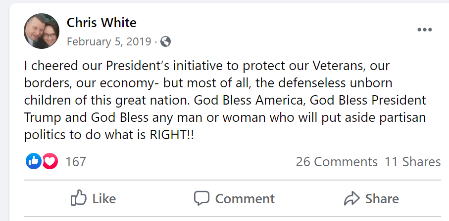 Thanks largely to the preaching of Wayne Kirk, Chris White has been exposed to a steady diet of White Christian Nationalism for two decades. When you share Brother Wayne’s most controversial sermons on Facebook (as White once did), you endorse the message.