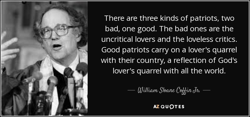 A moment ago I quoted Bill Coffin about nobody being saved after 20 minutes; and know I’m about to miss my altar call. But let me say one other thing that I think it was Coffin who said first. He said, “A true patriot is someone who loves their country enough to tell the truth about it.”